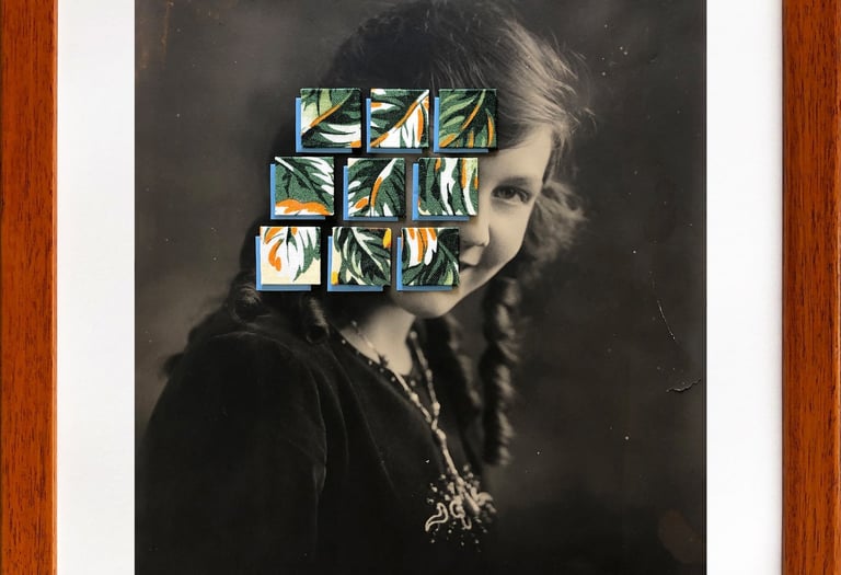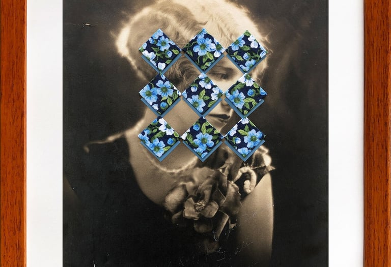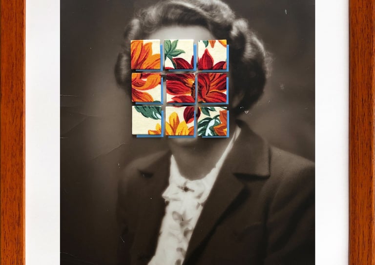 The fabrics in this series once belonged to my abuelita, remnants from her sewing atelier in Colombia. I used them to alter found portraits of women, interrupting and transforming their original context. These textiles—often linked to femininity and domestic labor—carry traces of the invisible work traditionally expected from women. Through this intervention, the portraits speak to memory, inheritance, and the roles women have been asked to perform.