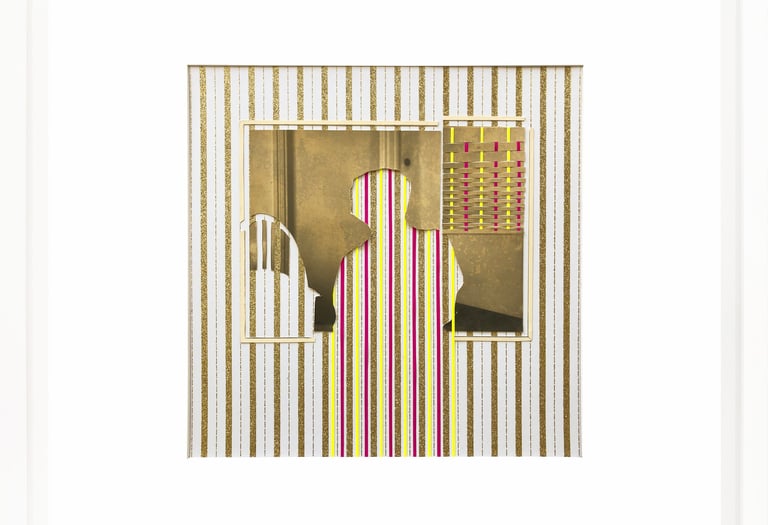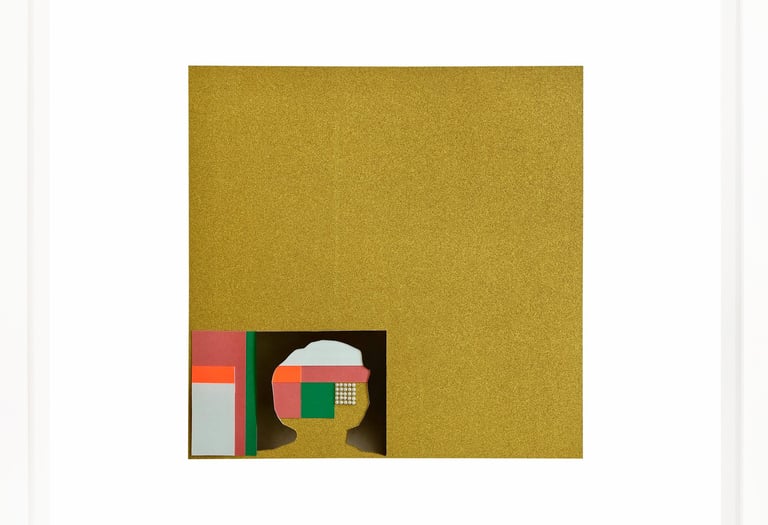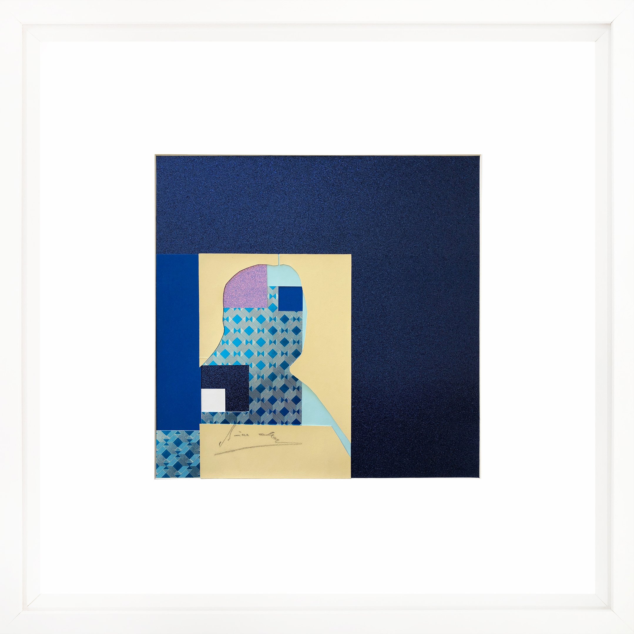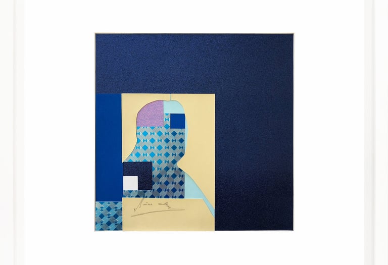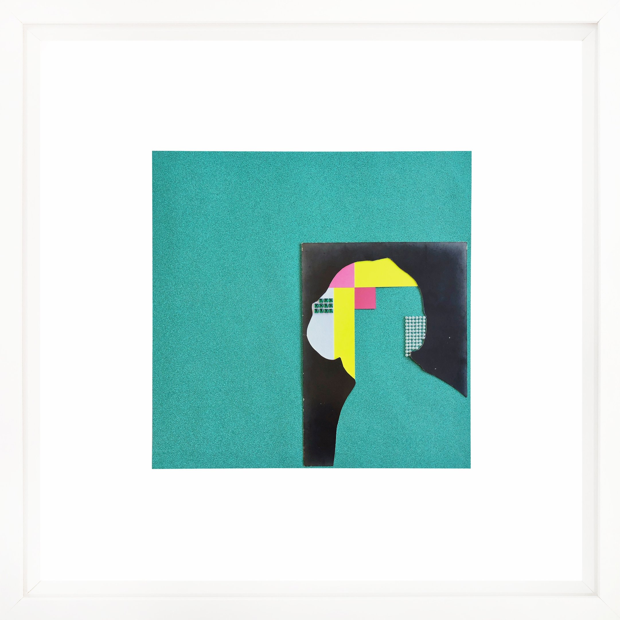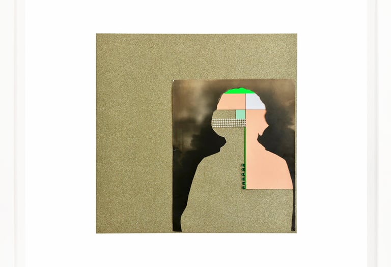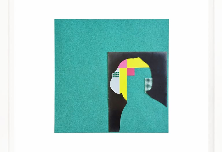 This work repurposes discarded studio portraits, focusing on absence as a space for reinterpretation. Through a deliberate process, I removed the faces, retaining only the silhouettes and staged backdrops. These fragmented figures are then reassembled into geometric compositions using everyday crafting materials in vibrant colors. The resulting works challenge the conventions of portraiture, transforming personal imagery into abstract symbols and raising questions about identity, memory, and the aesthetics of disappearance.