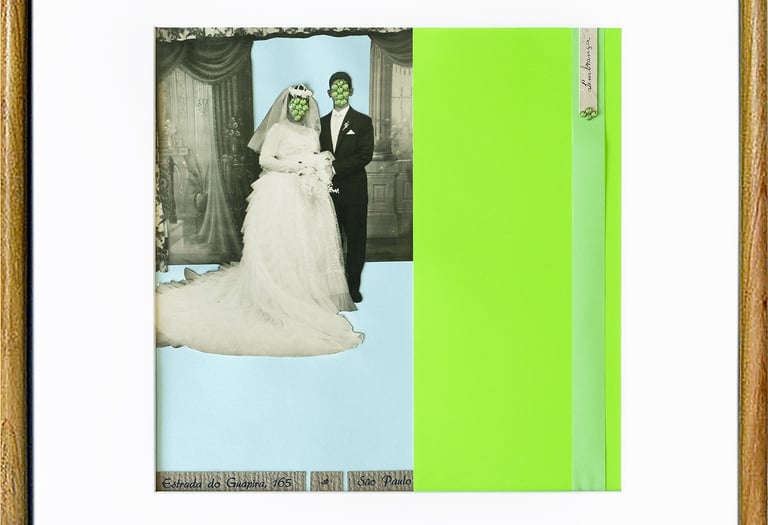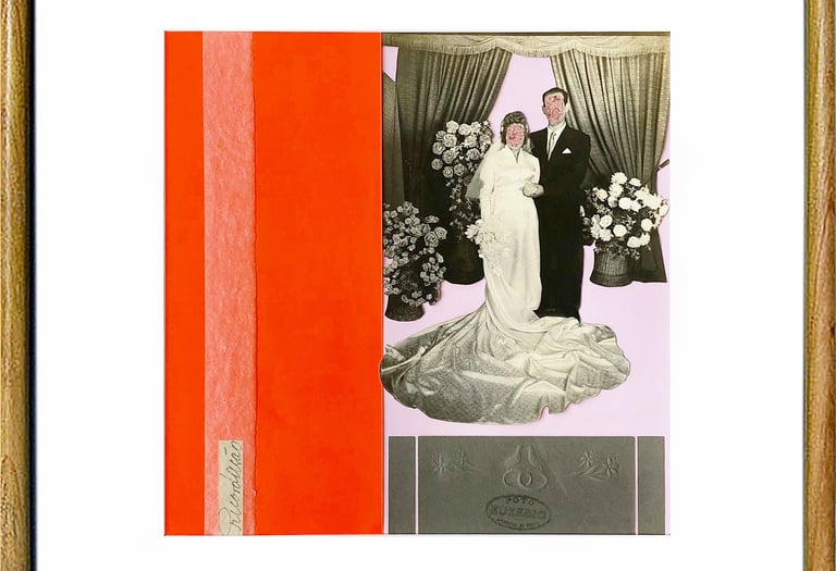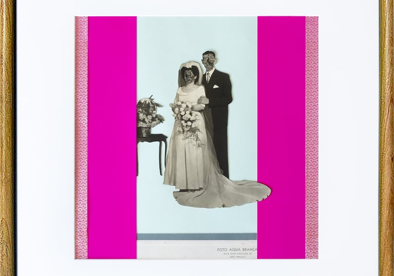 While wedding photographs are meant to immortalize one of life’s most celebrated rituals, they often end up discarded, forgotten remnants of deeply personal yet culturally scripted moments. In this series, I recover and reinterpret traditional newlywed portraits, focusing on the visual codes that shape them. By obscuring faces, I shift attention to the ritualized gestures and standardized compositions that define these images. Through collage and reconfiguration, I intervene in their narrative closure, disrupting the illusion of singularity and permanence to suggest alternative readings of identity, memory, and ceremony